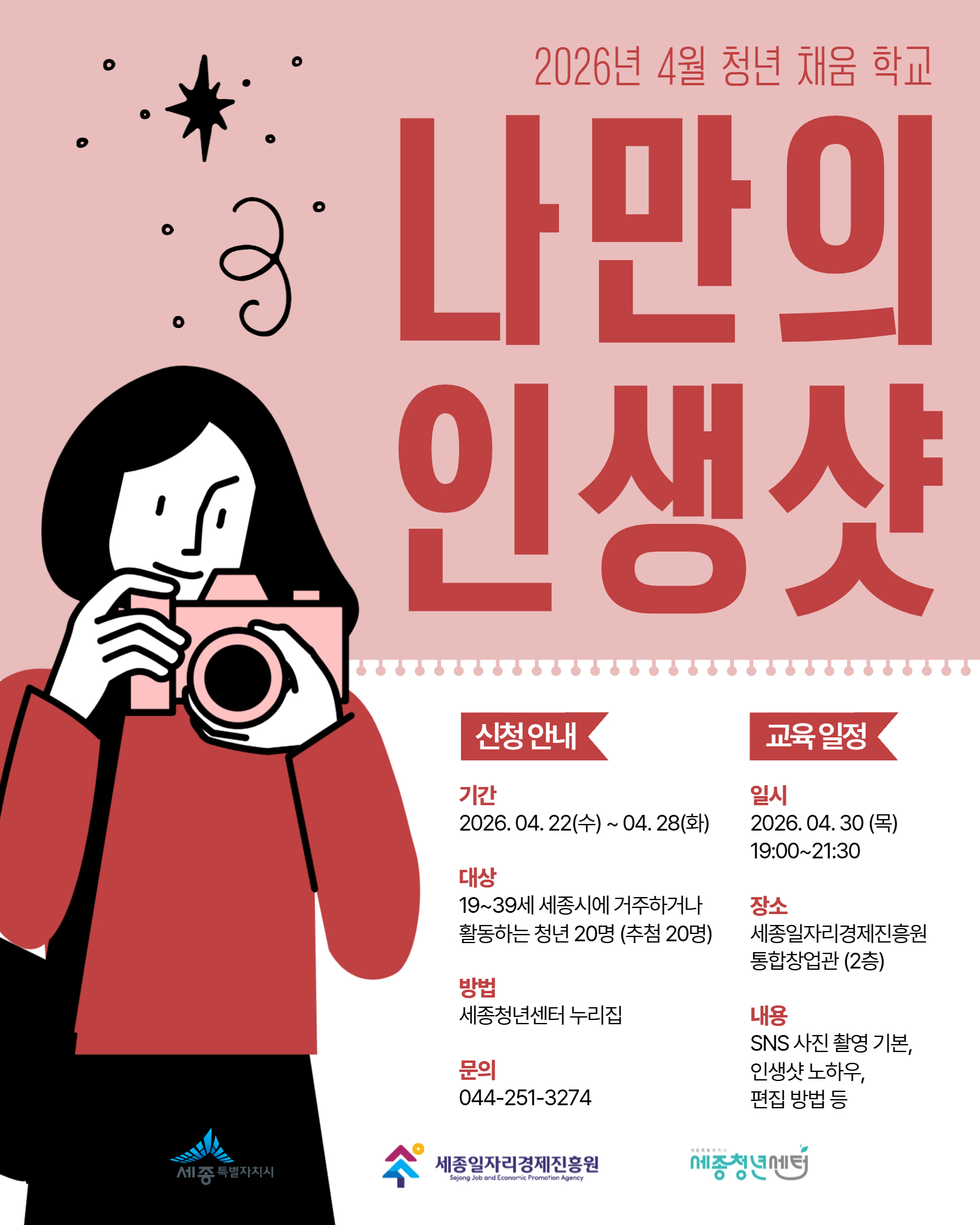 - 내용: SNS 사진 촬영 기본기, 편집 방법, 인생샷 꿀팁 등