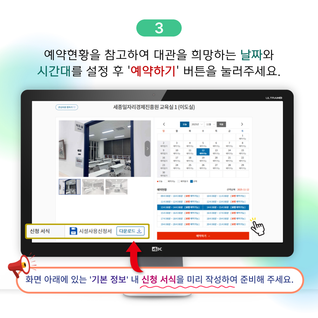 하단의 대관신청서를 작성 후, 공유누리 홈페이지 접속하여 신청할 수 있습니다.(대관 신청 절차 안내 사진 참고)