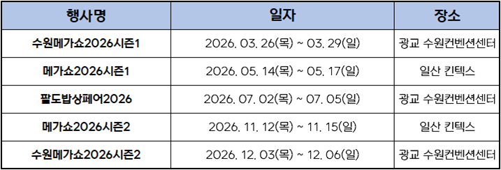 상반기 진행 예정 : <수원메가쇼2026 시즌1_수원 컨벤션센터>, <메가쇼2026 시즌1_킨텍스>, <팔도밥상페어2026_수원컨벤션센터>