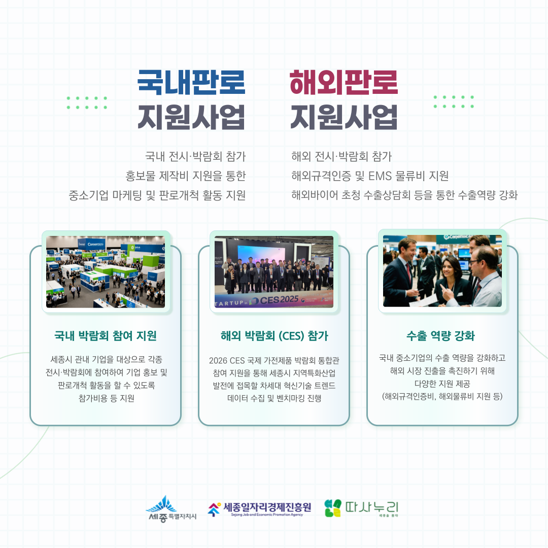 세종시 관내 기업을 대상으로 각종 전시·박람회 참가를 지원하는 사업과 '잡아타' 통근버스, 기숙사 임차비 지원 등