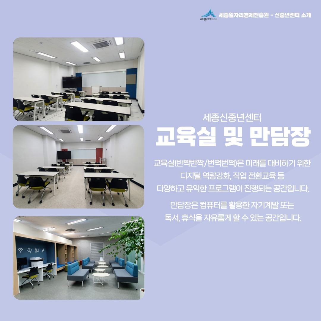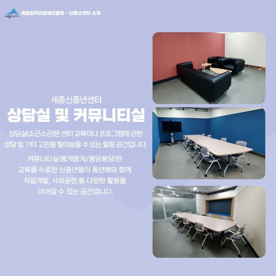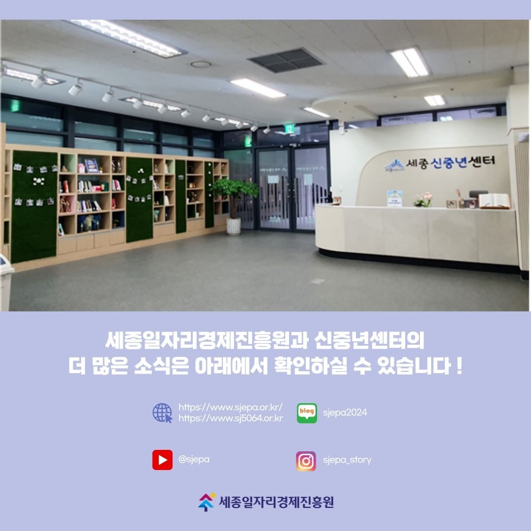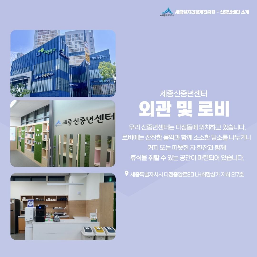 안녕하세요, 세종신중년센터를 소개합니다!세종신중년센터는 다정동 LH희망상가에 위치하고 있습니다.