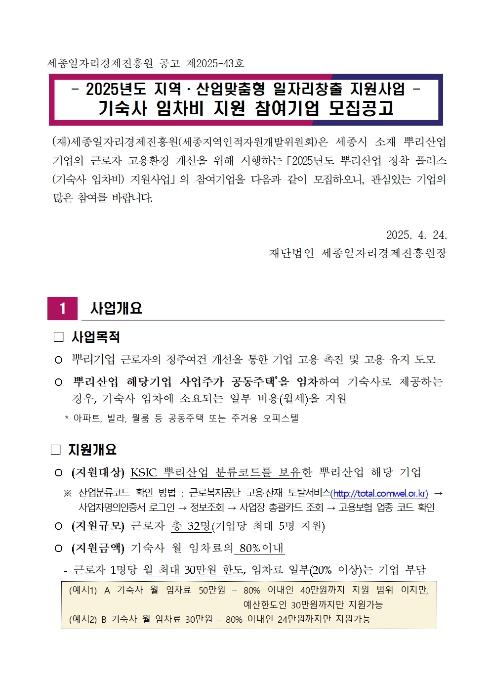 2025년도 뿌리산업 기숙사 임차비 지원 참여기업 모집 공고