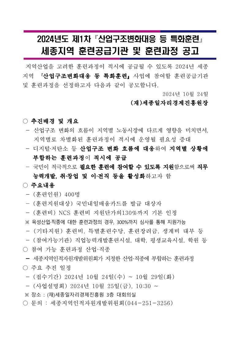 2024년도 제1차 『산업구조변화대응 등 특화훈련』 세종지역 훈련공급기관 및 훈련과정 공고