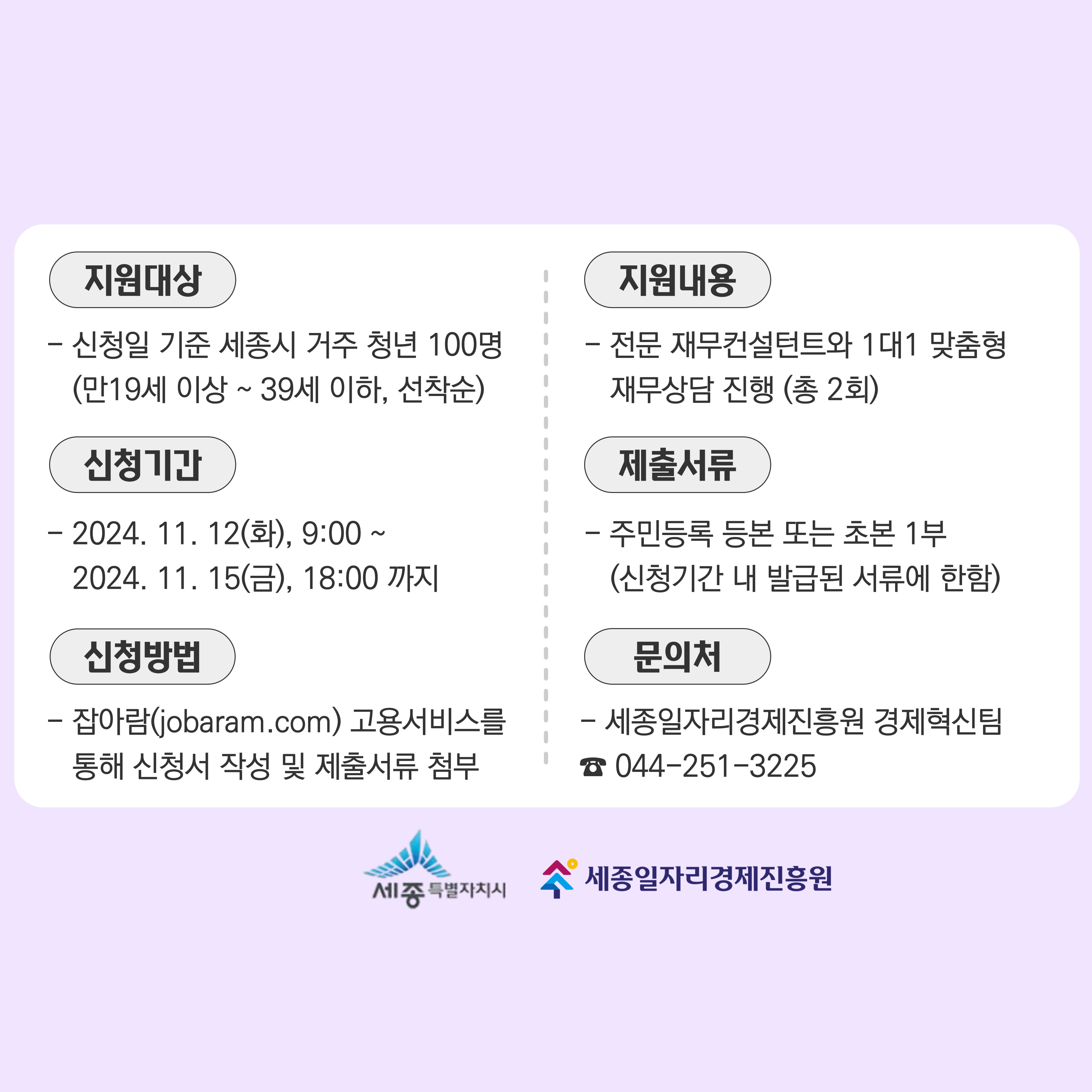 '2024년 세종시 청년 재무컨설팅' 참여자 모집 공고를 아래와 같이 시행하오니,