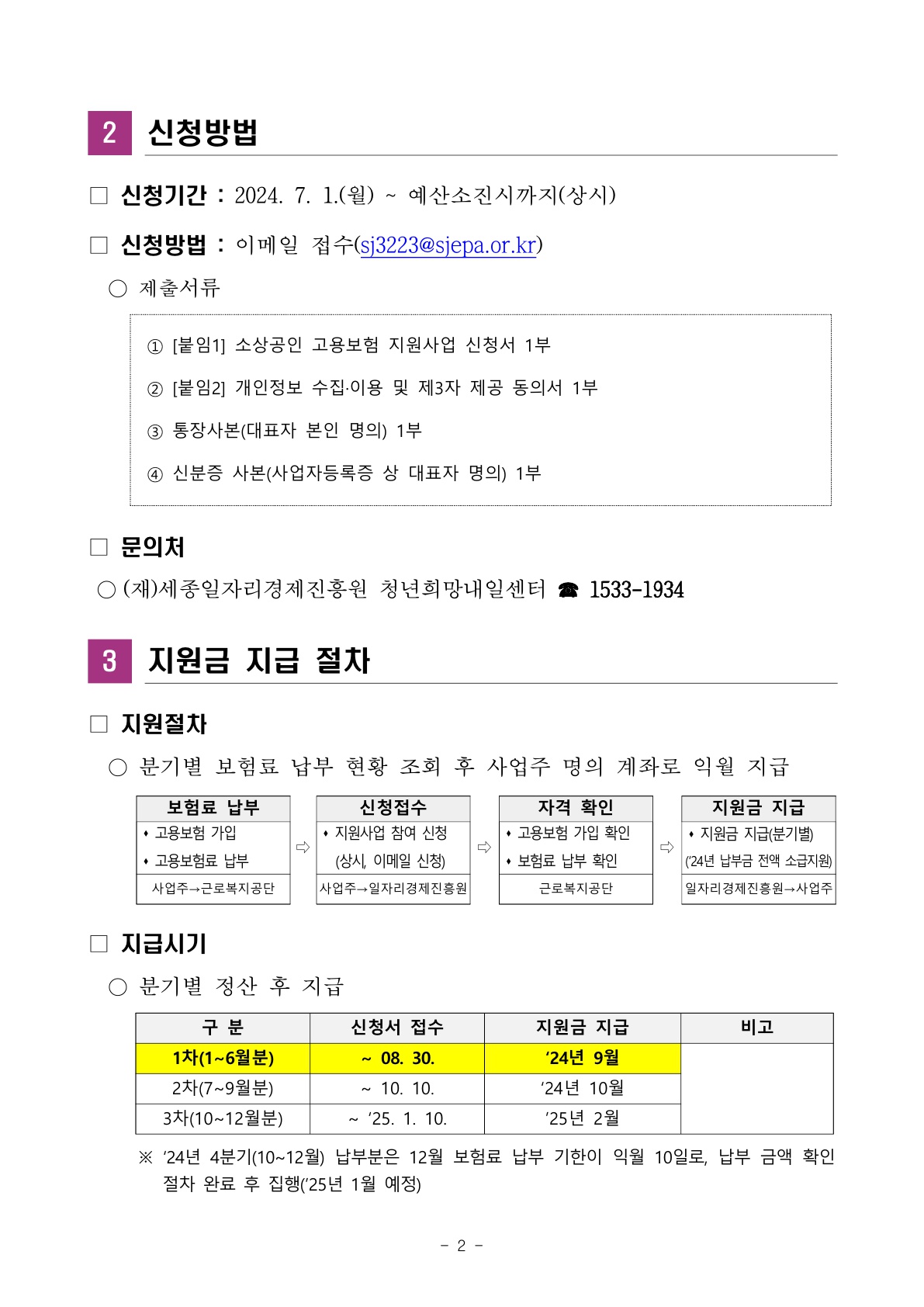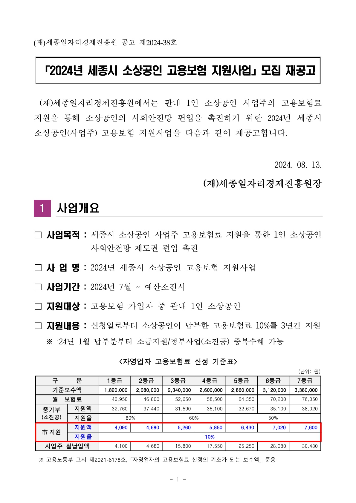 2024년 세종 소상공인 고용보험료 지원사업 재공고(2024. 7. 1.~예산소진시)
