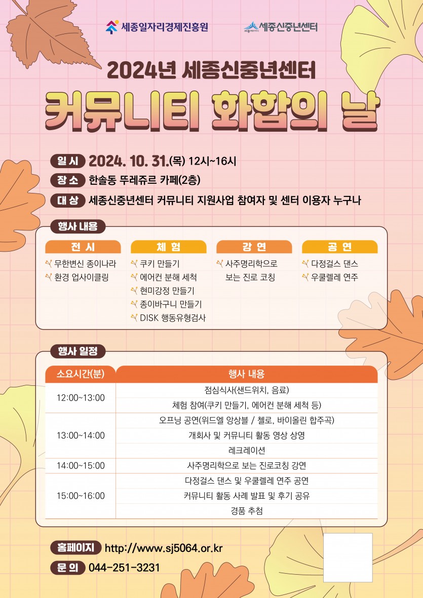 신중년센터 커뮤니티 화합의 날 행사가 10월 31일(목)에 개최되오니,