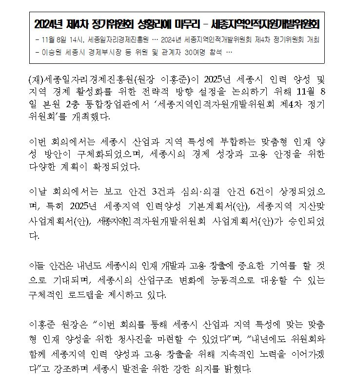 (20241108)2024년 제4차 정기위원회 성황리에 마무리 – 세종지역인적자원개발위원회