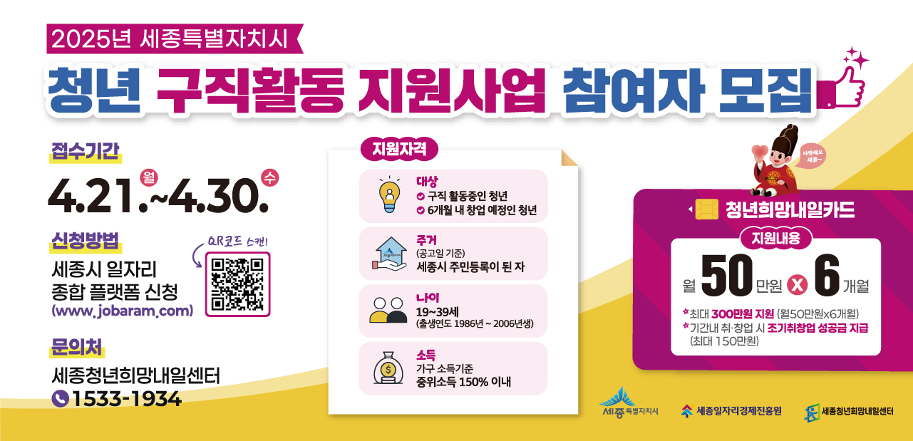 사업 공고 확인 및 참여 신청은 세종시 종합 일자리 플랫폼(jobaram.com)에서, 관련 문의는 청년희망내일센터(☎1533-1934)로 하면 된다.