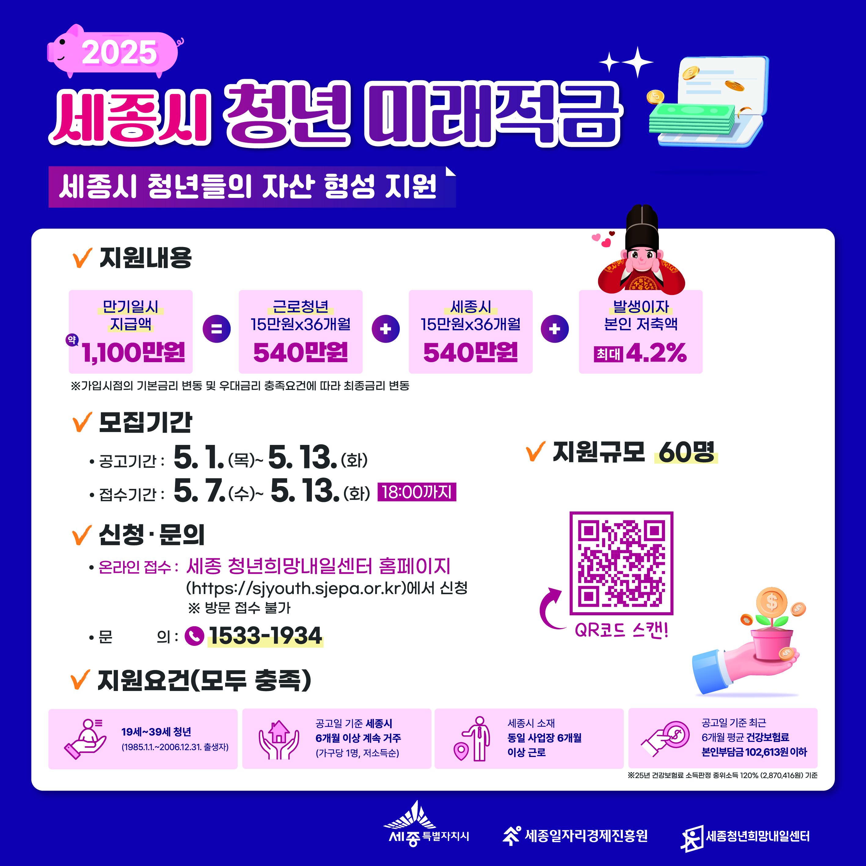 세종특별자치시(시장 최민호)와 세종일자리경제진흥원(원장 이홍준)이 오는 7일부터 13일까지 ‘2025년 세종청년미래적금’ 참여자를 모집한다.