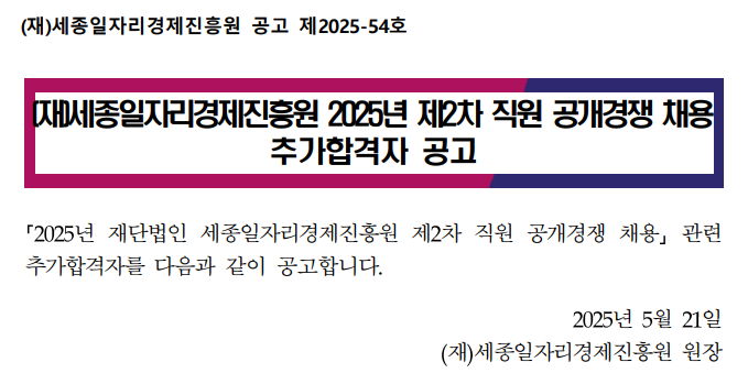(재)세종일자리경제진흥원 2025년 제2차 직원 공개경쟁 채용 추가합격자 공고