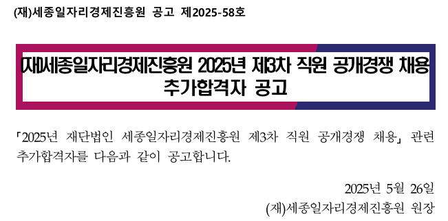 (재)세종일자리경제진흥원 2025년 제3차 직원 공개경쟁 채용 추가합격자 공고