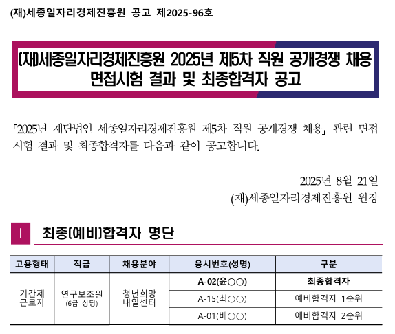 (재)세종일자리경제진흥원 2025년 제5차 직원 공개경쟁 채용 면접시험 결과 및 최종합격자 공고