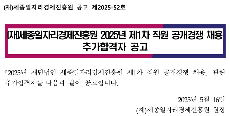(재)세종일자리경제진흥원 2025년 제1차 직원 공개경쟁 채용 추가합격자 공고