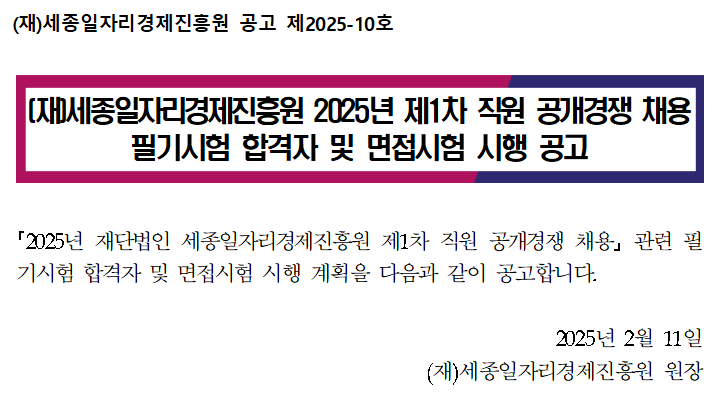 (재)세종일자리경제진흥원 2025년 제1차 직원 공개경쟁 채용 면접시험 결과 및 최종합격자 공고