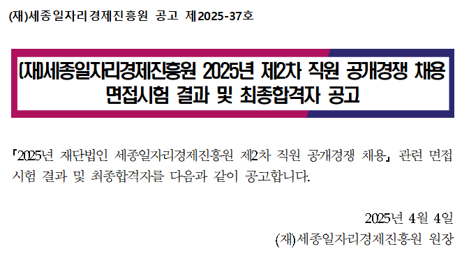 (재)세종일자리경제진흥원 2025년 제2차 직원 공개경쟁 채용 면접시험 결과 및 최종합격자 공고