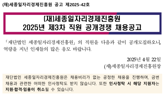 (재)세종일자리경제진흥원 2025년 제3차 직원 공개경쟁 채용공고