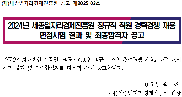 2024년 세종일자리경제진흥원 정규직 직원 경력경쟁 채용 면접시험 결과 및 최종합격자 공고