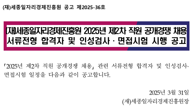 (재)세종일자리경제진흥원 2025년 제2차 직원 공개경쟁 채용 서류전형 합격자 및 인성검사·면접시험 시행 공고