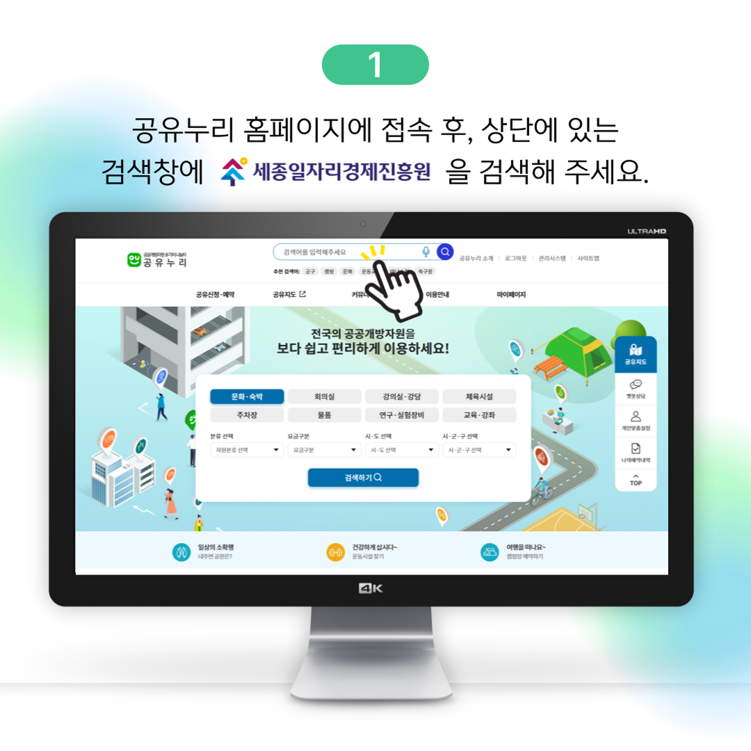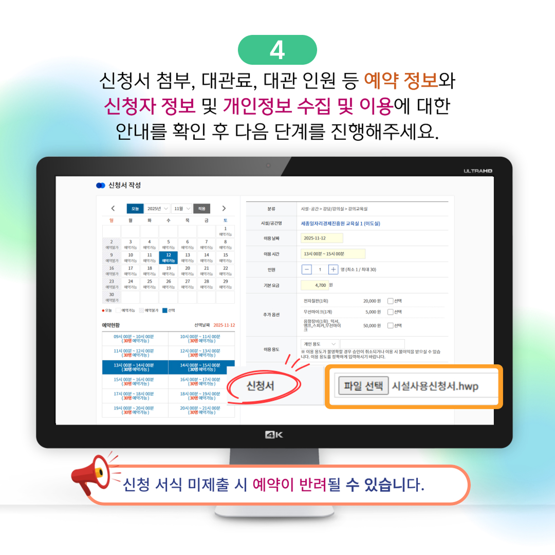 하단의 대관신청서를 작성 후, 공유누리 홈페이지 접속하여 신청할 수 있습니다.(대관 신청 절차 안내 사진 참고)