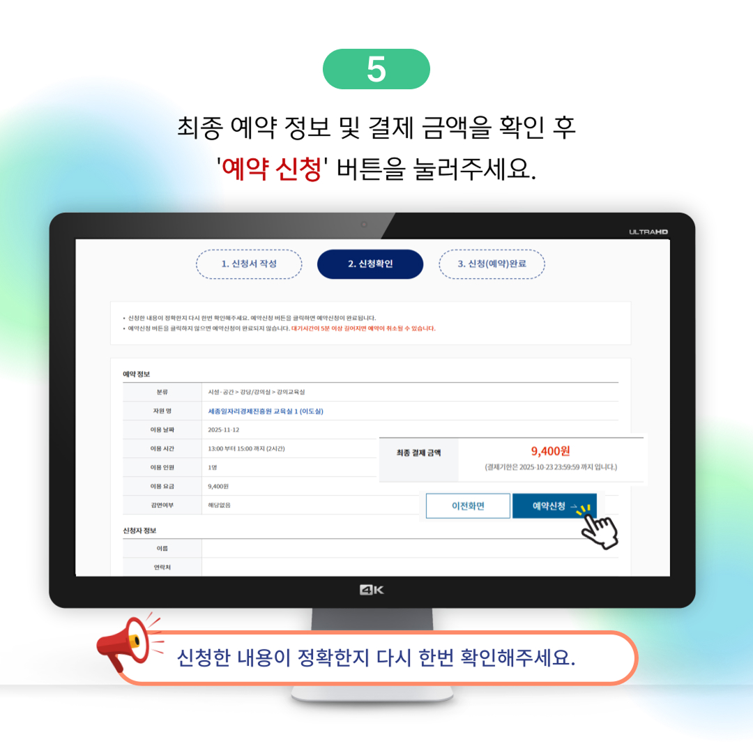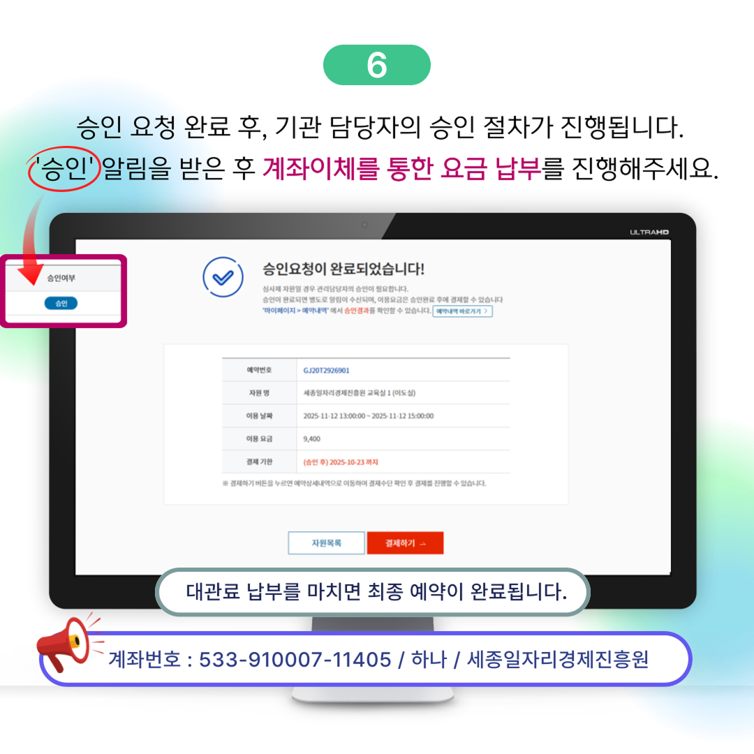 - - 대관료 납부 계좌 : 533-910007-11405 (하나은행), 담당자 안내 후 납부 진행