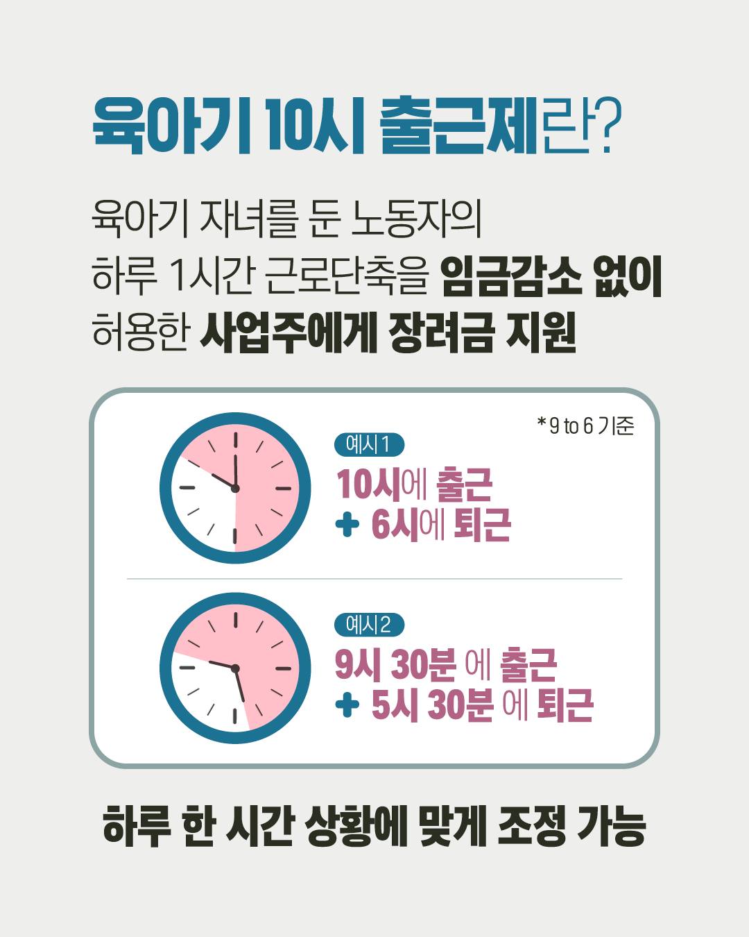 ㅇ 육아기 10시 출근 제도 도입․활용(1月이상) → 사업주가 지원금 신청(고용24 홈페이지: www.work24.go.kr) → 지원금 지급(고용센터☎1350)