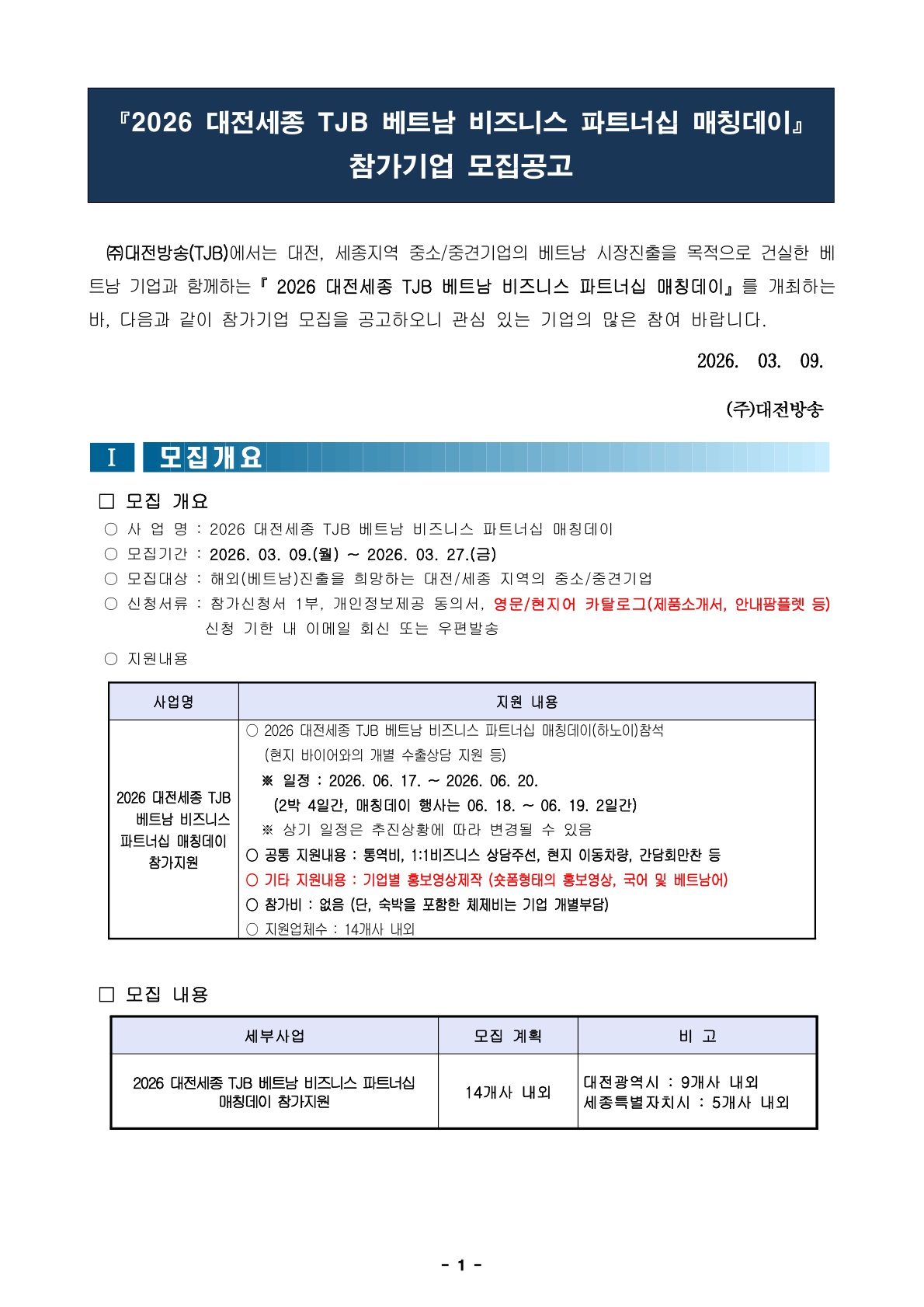 [(주)대전방송, 세종특별자치시] '2026 대전세종 TJB 베트남 비즈니스 파트너십 매칭데이' 참가기업 모집공고