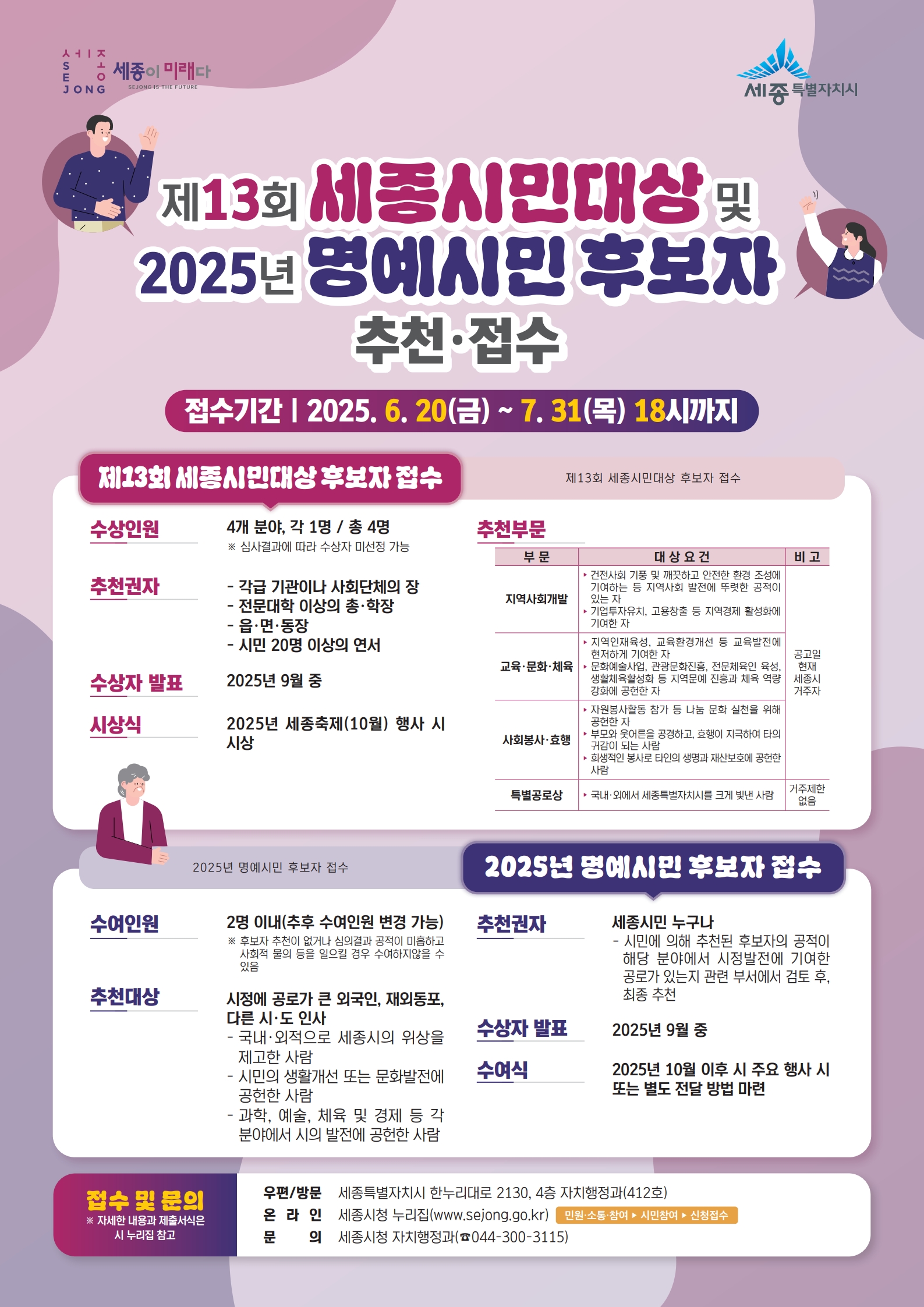 [세종특별자치시청 자치행정과] 제13회 세종시민대상 및 2025년 명예시민 후보자 추천·홍보 요청