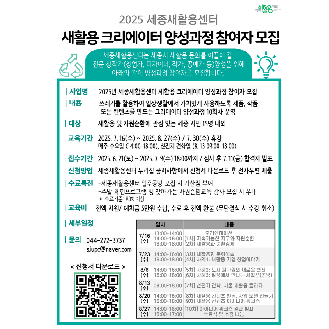 [2025년 세종새활용센터 새활용 크리에이터 양성과정 참여자 모집 공고]