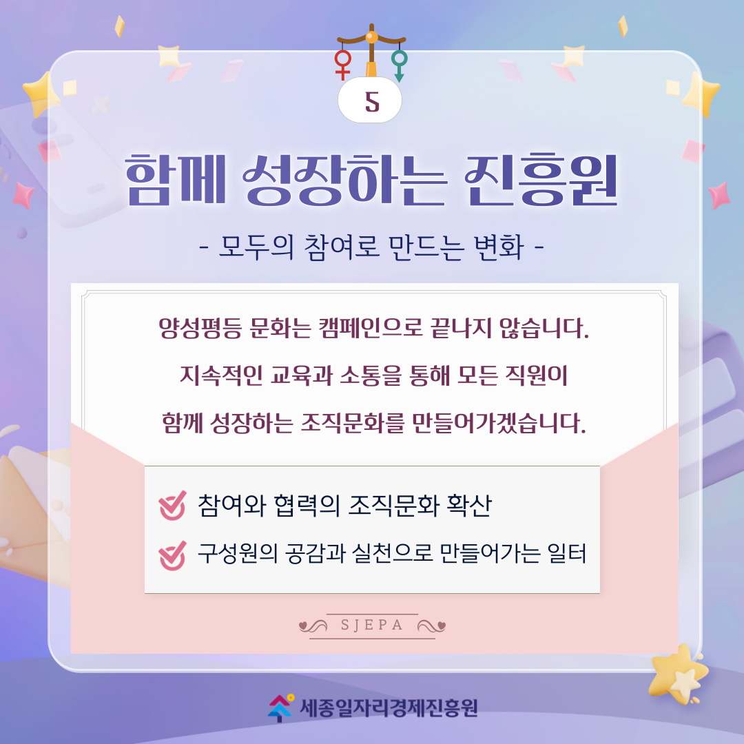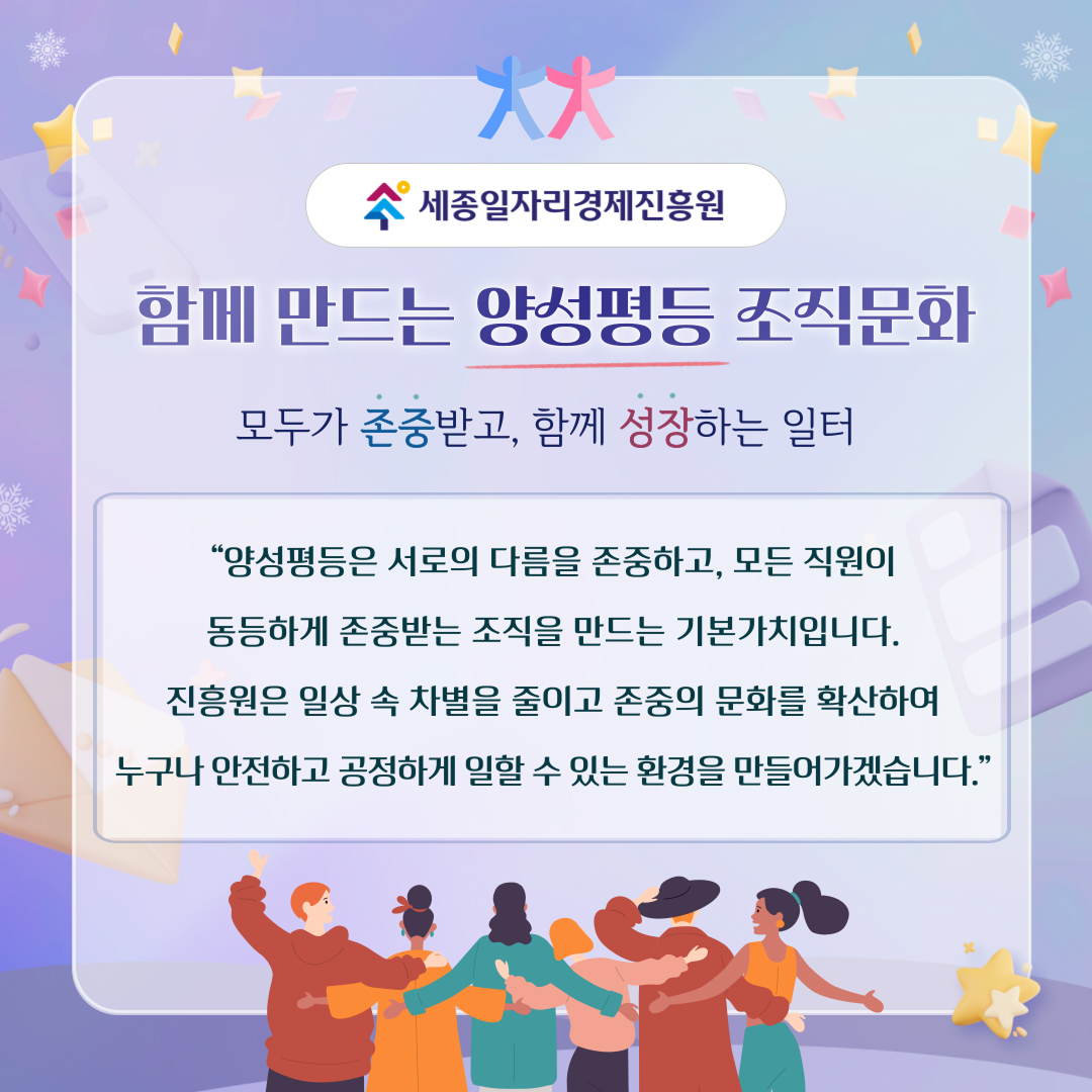 양성평등 문화는 캠페인으로 끝나지 않습니다. 지속적인 교육과 소통을 통해 모든 직원이 함께 성장하는 조직문화를 만들어가겠습니다.