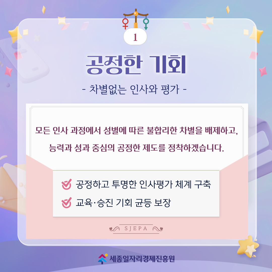 모든 인사 과정에서 성별에 따른 불합리한 차별을 배제하고, 능력과 성과 중심의 공정한 제도를 정착하겠습니다.