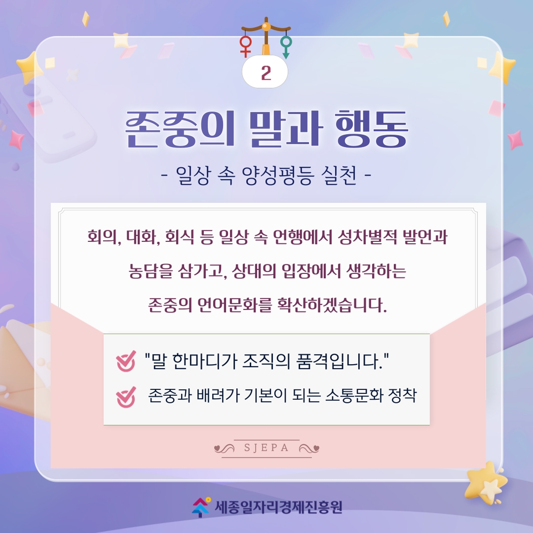 회의, 대화, 회식 등 일상 속 언행에서성차별적 발언과 농담을 삼가고,상대의 입장에서 생각하는 존중의 언어문화를 확산하겠습니다.
