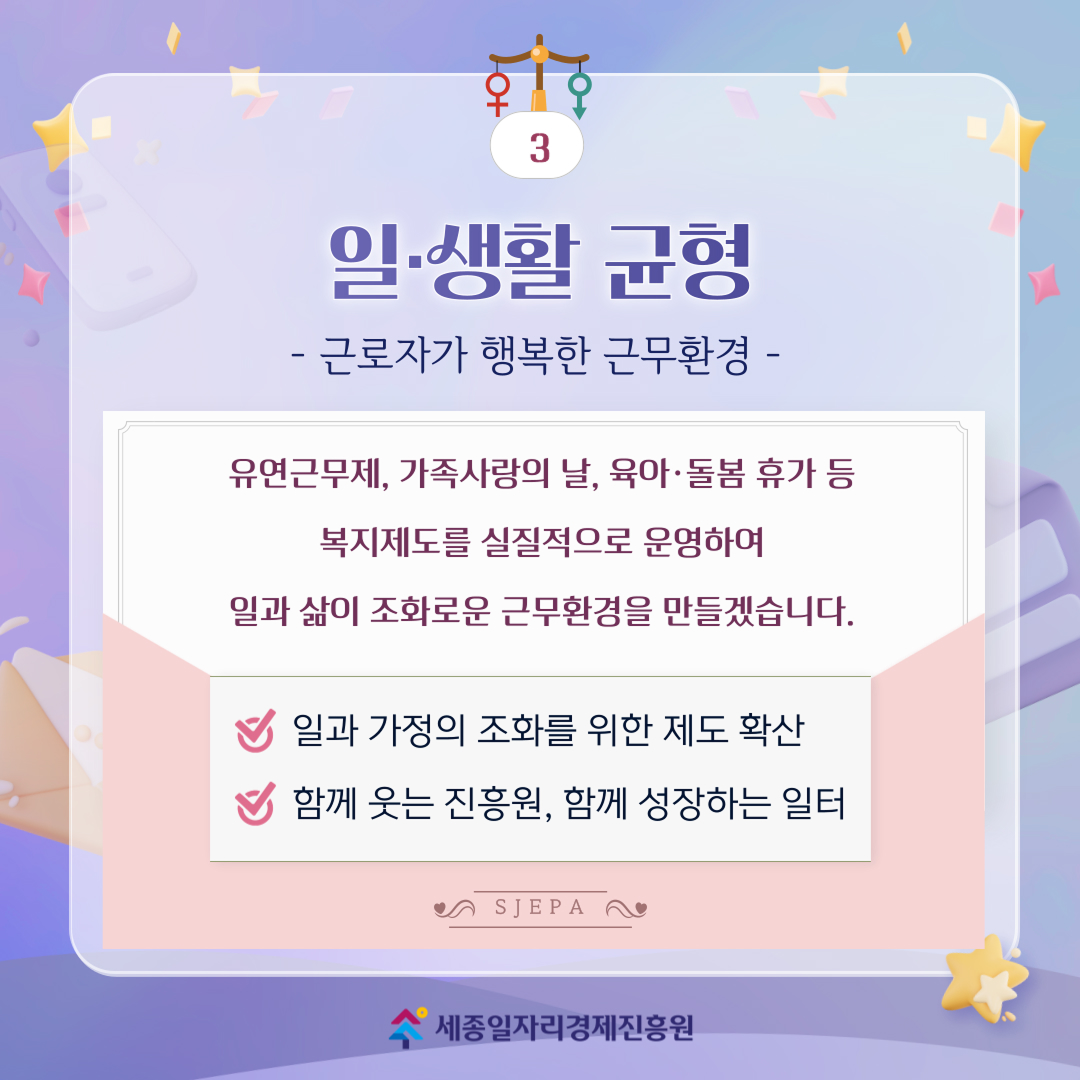 유연근무제, 가족사랑의 날, 육아·돌봄 휴가 등 복지제도를 실질적으로 운영하여 일과 삶이 조화로운 근무환경을 만들겠습니다.
