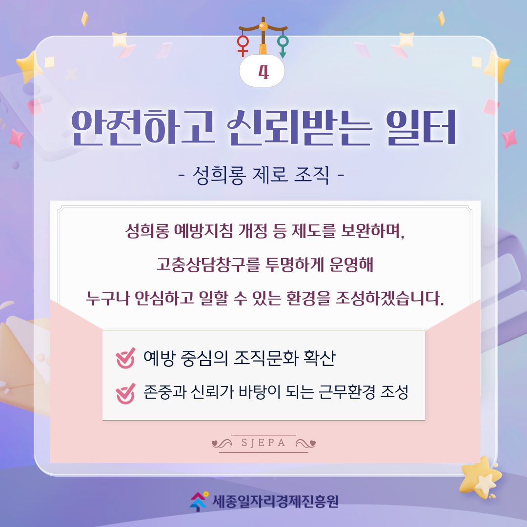 성희롱 예방지침 개정 등 제도를 보완하며, 고충상담창구를 투명하게 운영해 누구나 안심하고 일할 수 있는 환경을 조성하겠습니다.